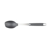 Dish out deliciousness with a kitchen utensil essential. Form meets function in a solid spoon ideal for use with nonstick cookware. Heat safe to 400°F, dishwasher safe for convenience, and built with a sturdy stainless steel neck and tapered head perfect for mixing, blending and serving.